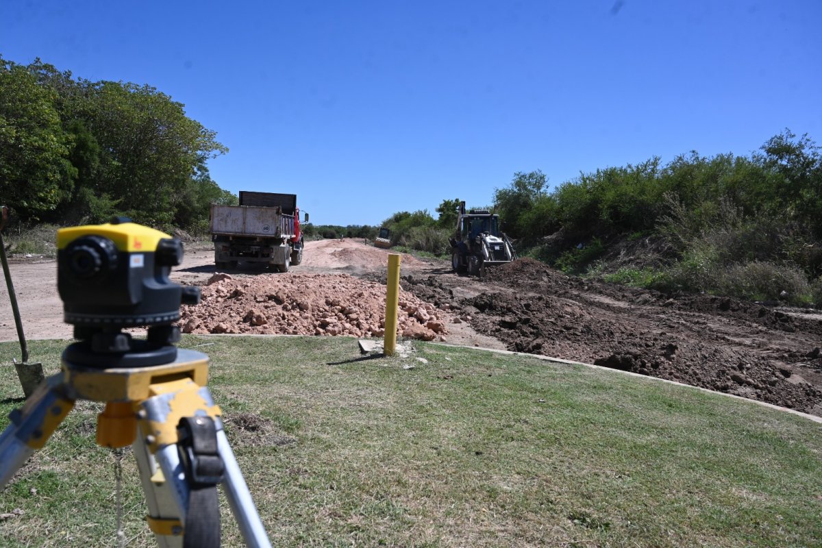 En paralelo, se llevan adelante los trabajos de definición de anchos y calzado del terreno, que permiten estabilizar la base y asegurar un perfil uniforme de la calzada: estas acciones se concentran entre la intersección con calle Federación y la curva que retoma el trazado hacia la Ruta Nacional n°136.