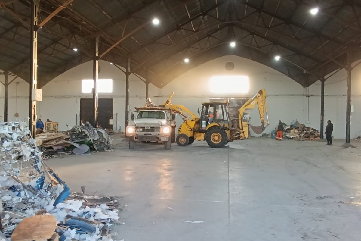 Durante la jornada se emplearon palas cargadoras, camiones volcadores y maquinaria vial que permiten avanzar con la limpieza del amplio galpón, donde también se observa la participación de trabajadores municipales que barrieron y clasificaron residuos voluminosos.